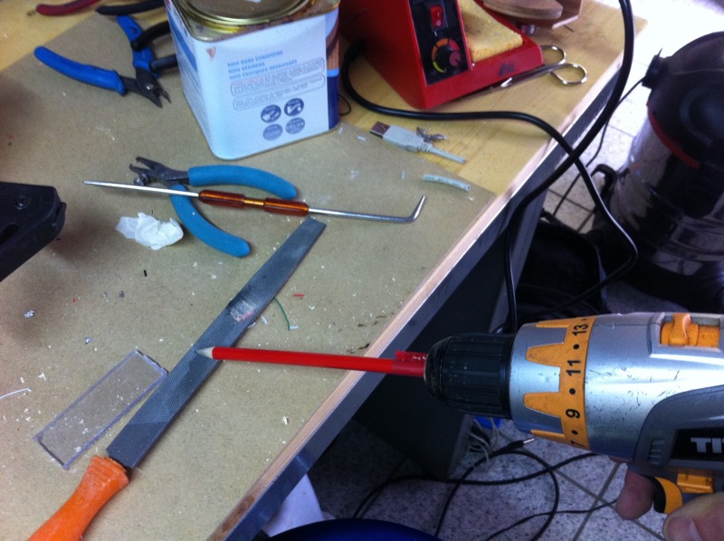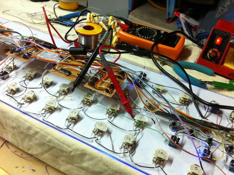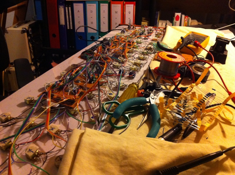 My workspace during the long process of cutting, stripping and soldering a lot and a lot of wires.(((60 pots + 2 wheels) * 3 pins) + (27 buttons * 2 pins) + (26 LEDs * 2 pins)) * (2 extremities of cable) = 584 solders [1]