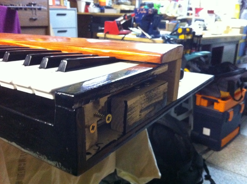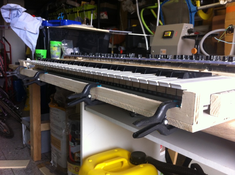 Here is the naked old keyboard that I used for this project, recycled from a Casio whatever-the-name with really bad sounds. Maybe It was used for children to learn piano two decades from now ? whatever, the touch was pretty close to synthesizer's one, plus it has a nice built-in MIDI-out port that I kept.