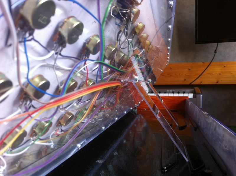 I added the backlight a couple of months after the whole projects was done (at least I thought so), and didn't took any picture during the installation. It was quite easy though: I just glued strips of RGB LEDs inside the aluminum corners of the Plexiglas control panel, which are controlled by a small unit just next to the Arduino via a small remote. Now we can see the wires better (as I wanted to), and it provides an excellent backlight to the control panel, which is more than convenient when playing on a dark stage.6. Electronics: how it works