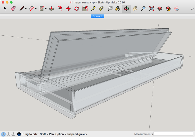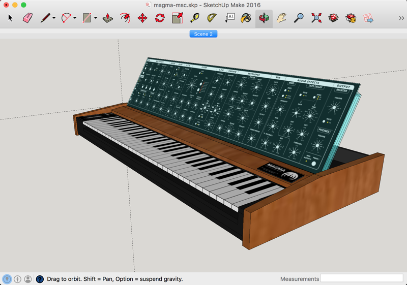 I you're reading this and you work at the local print shop I talked a few lines above, maybe it's your fault if my synth is actually a little bit smaller that intended. Indeed, I didn't brought a tape measure to check if the dimensions of the panels was 100% accurate; but i should have. The main panel you saw was supposed to be exactly 970 mm wide, but the print is around 930. Which means that I had to shrink the octave and wheels panel down by 5 cm. I suppose it's not such a bad thing since it's pretty comfortable to the left hand not to have a bigger space between the two wheels. But I'm still mad. Grrr. I designed the whole MAGMA M.S.C. on SketchUp, which allowed me to provide any details on the construction of the case.